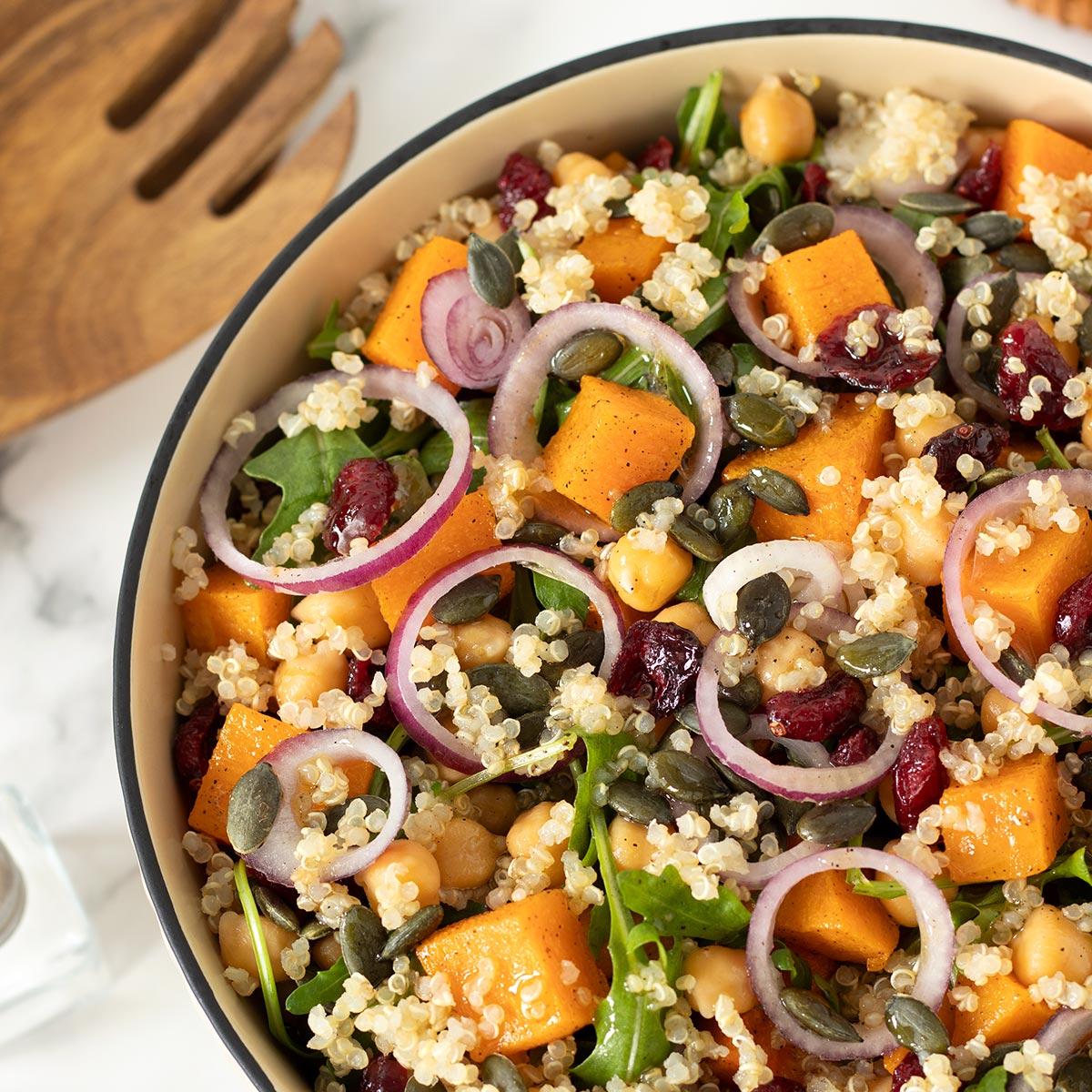 - In a large bowl, combine roasted pumpkin, quinoa, chickpeas, arugula, red onion, pumpkin seeds, and dried cranberries. Drizzle with dressing and toss gently to combine.6 cups arugula, 1 small red onion, 3 tablespoons pumpkin seeds, 2 tablespoons dried cranberries, 1 + ½ cups cooked chickpeas