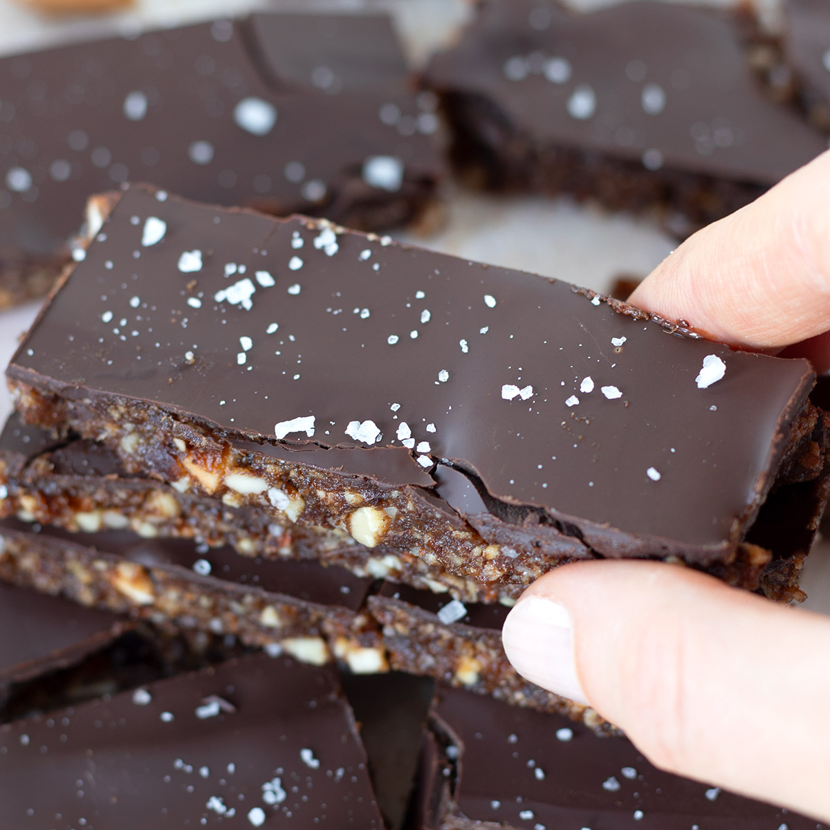 These bars hit that perfect balance of chewy, soft dates, crunchy nuts, rich cocoa flavor, and a glossy layer of melted dark chocolate topped with a sprinkle of sea salt.