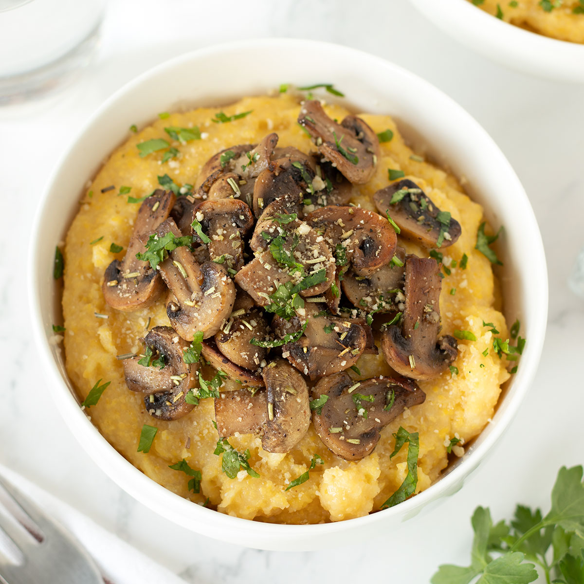 - Immediately spoon warm polenta into bowls (it sets quickly), top with the sautéed mushrooms, and finish with fresh parsley and vegan parmesan.