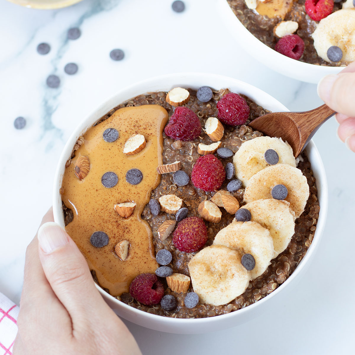- Transfer the chocolate quinoa porridge into bowls and top with your favorites. I love peanut butter, sliced banana, raspberries, and chopped almonds for crunch.